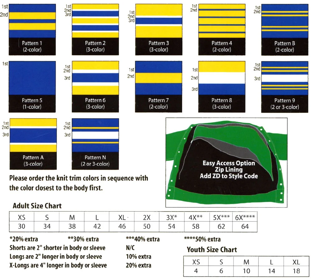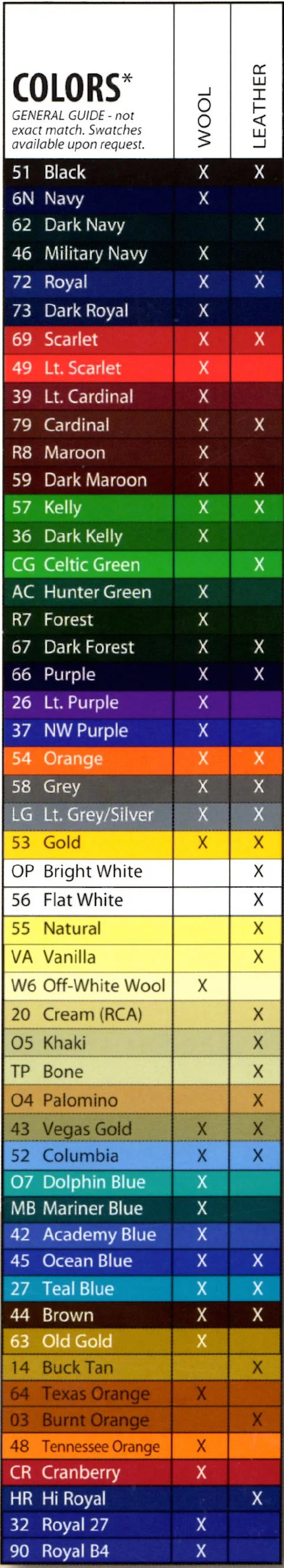 *colors are merely a standard representation and are not an exact match. Colors will vary according to fabric. We strongly recommend using actual swatches to determine your color needs for your letterman jacket. Please call for examples. 801-699-9067